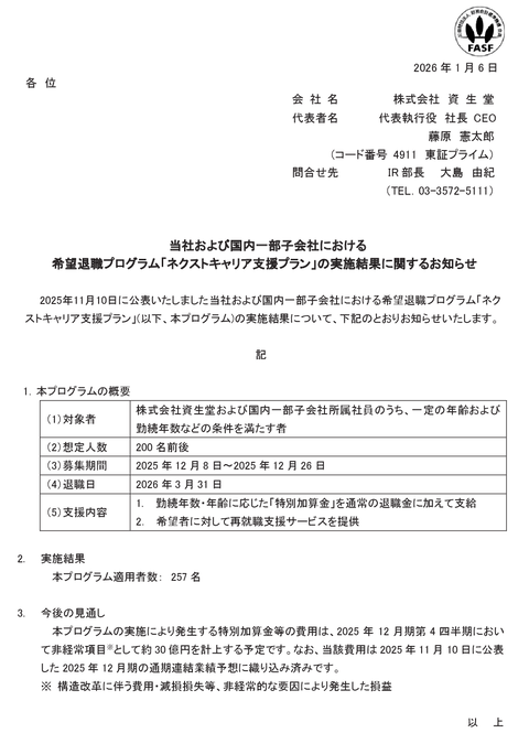 大赤字の資生堂、ネクストキャリア支援プランという名の希望退職で想定200人を上回る257人が逃げ出す